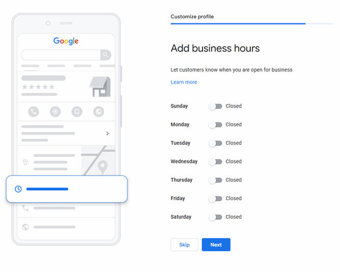 Add your standard business hours to show customers if you are open or closed. Your business hours will be displayed on your knowledge panel in Google search results, and can be used to help searchers see if your business is open or closed in local packs.