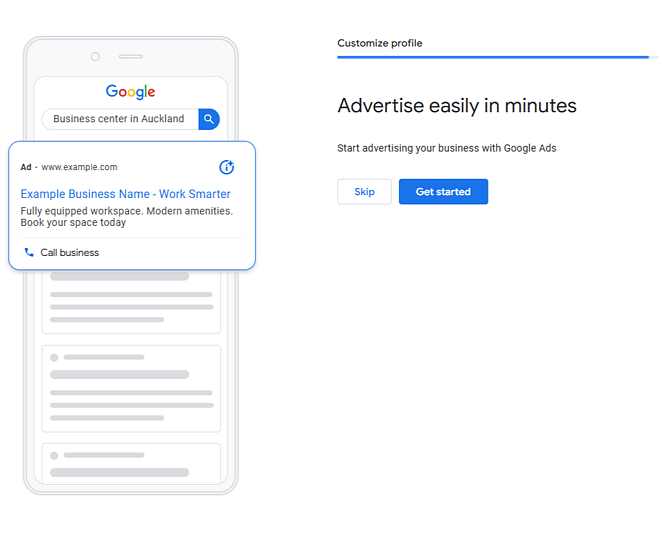 If you want to advertise your business on Google you can set that up here. Follow the steps to get started with your Google Ads account.